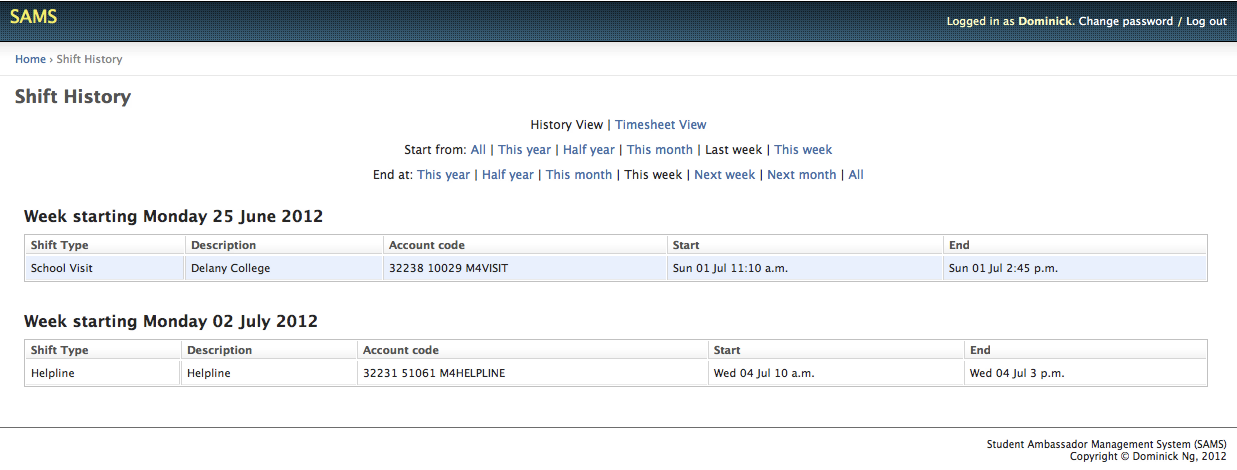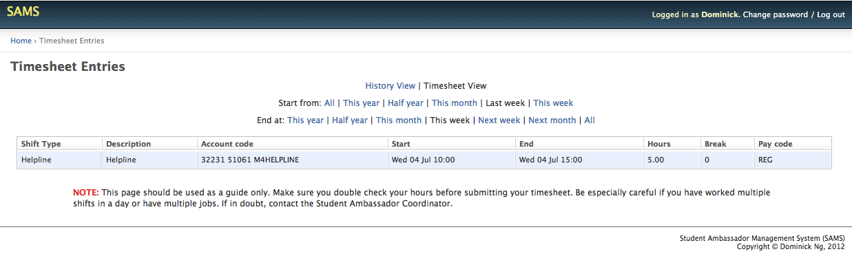 This lists the shifts you've done, as well as the appropriate paycodes for timesheets. You can filter the page by various time slices using the links at the top.