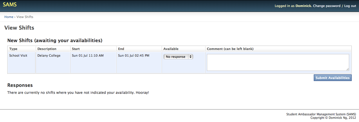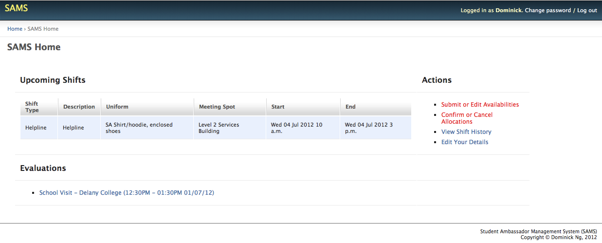 SAMS is the Student Ambassador Management System. It's a centralised, online interface to manage your shifts with Student Recruitment at the University of Sydney.