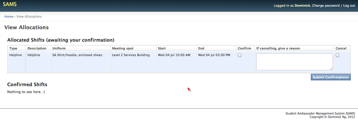 This page shows you the shifts you have been allocated to. You must acknowledge each shift that you are allocated to by ticking "Acknowledged" and submitting the confirmations. This lets the Student Recruitment Unit know that you have received the allocation and will show up on the day.